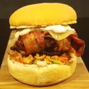 Pão Bilha, Hambúrguer artesanal de Costela com BACON, enrolado com BACON, mussarela, Maionese de BACON, Crispy Onion e Vinagrete