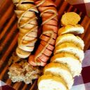 2 Salsichões alemães, Chucrute, Pão de fermentação natural, mostarda escura e molho curry